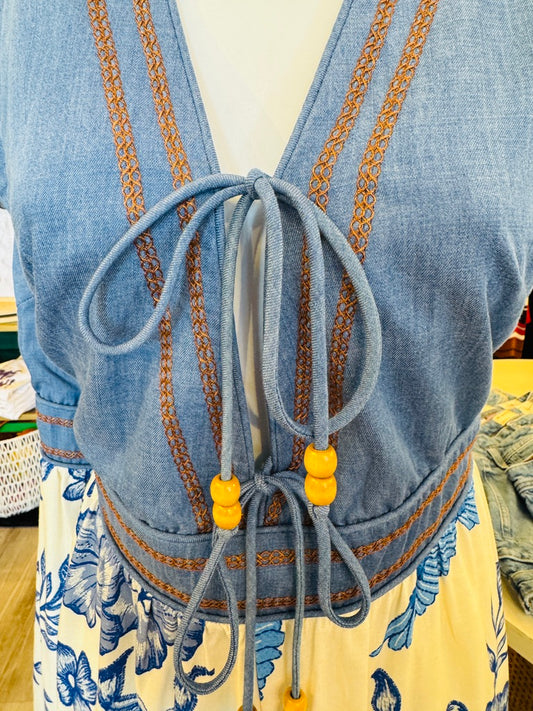 AUBREY PRINTED PATCHWORK DENIM MIDI DRESS