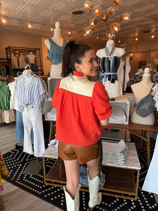DENIM SILVER STUDDED FRINGE FRONT TIE SHIRT