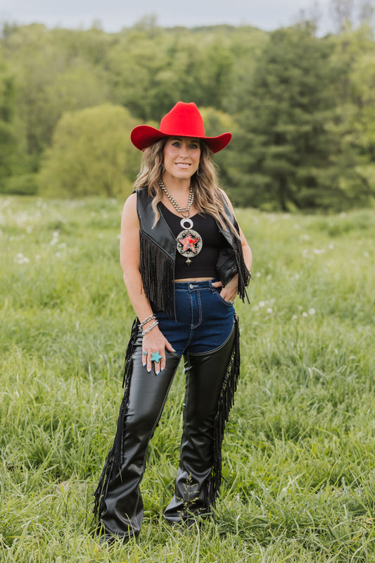 DENIM CHAPS FRINGED PANTS