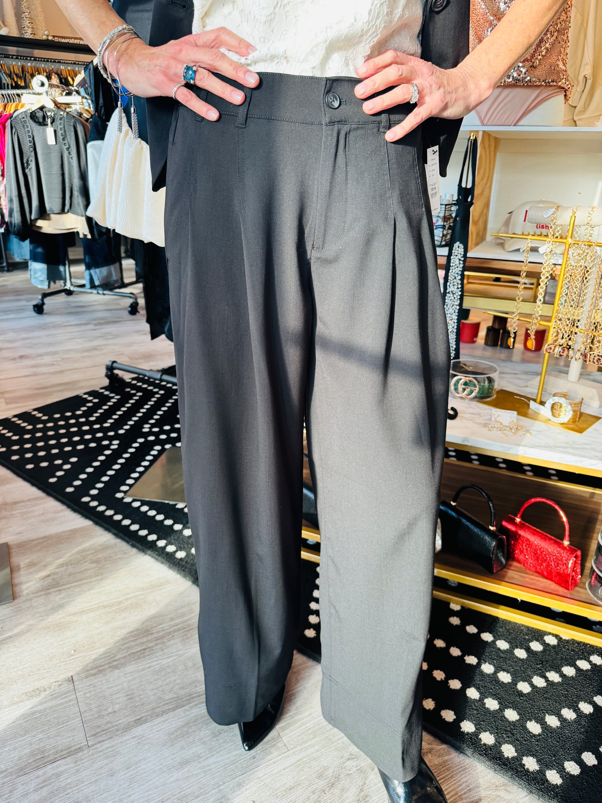 This high rise trouser is all about effortless confidence. Soft pleats create movement through the wide leg, while a clean front keeps the look polished and easy to wear. Designed to sit comfortably at the waist with just the right amount of structure, it feels pulled together without trying too hard. Dress it up with our matching puff sleeve blazer or keep it relaxed with a knit.