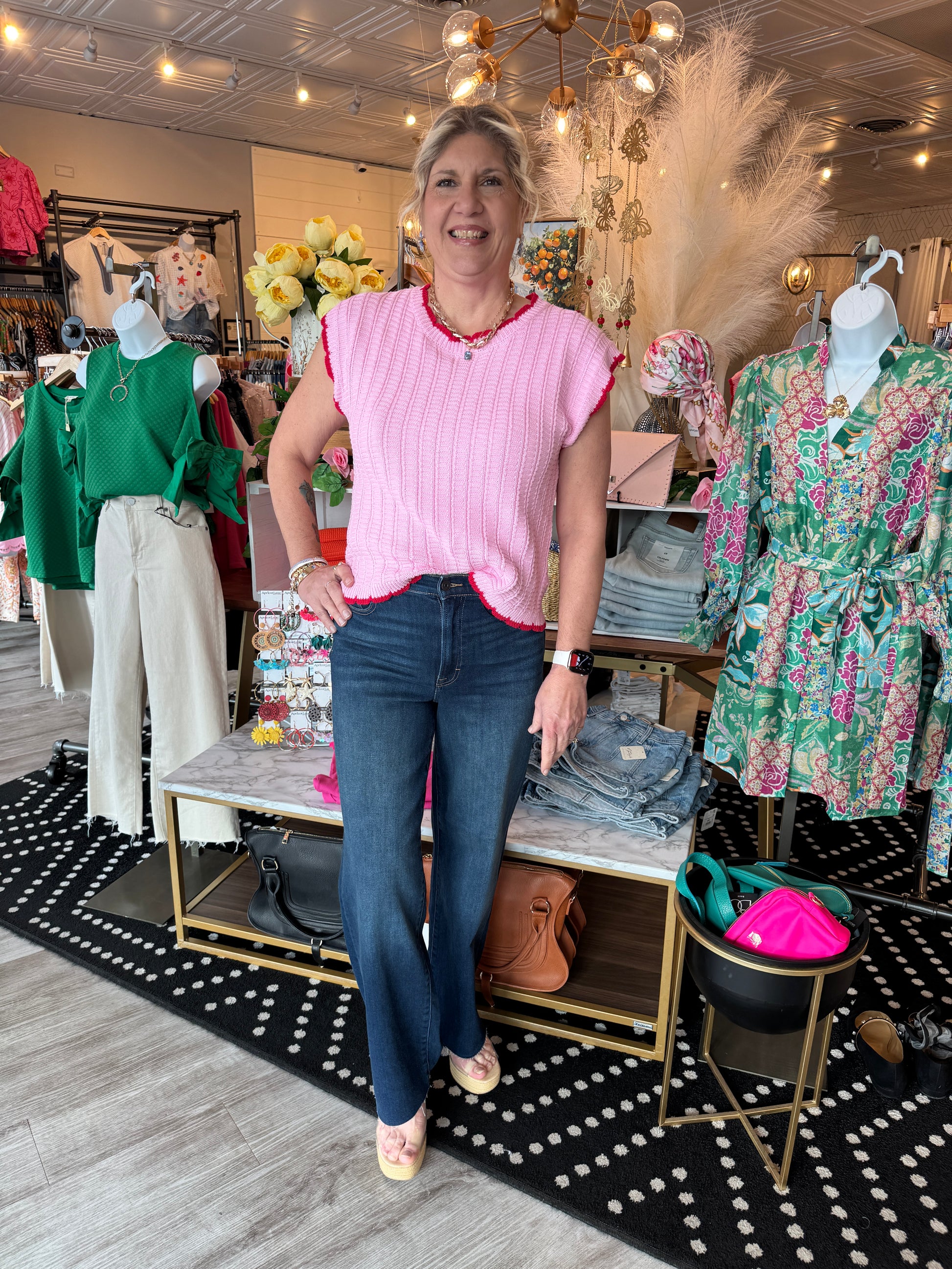Effortless elegance meets versatile style with this sleeveless knit top. The soft pink base pairs beautifully with striking red accents, creating a modern color-block design that transitions seamlessly from casual to polished. The lightweight knit fabric offers comfortable all-day wear, while the sleeveless silhouette keeps you cool and shows off your personal style. Perfect for layering or wearing solo, this piece is a wardrobe essential for any season.
